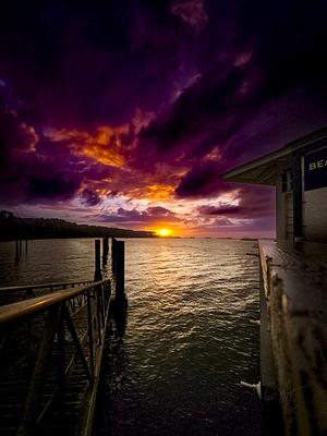 Alt Text for SEO: "A vivid sunset scene on Daufuskie Island with deep purple and orange clouds filling the sky, a dock leading into the water, and the sun setting on the horizon."